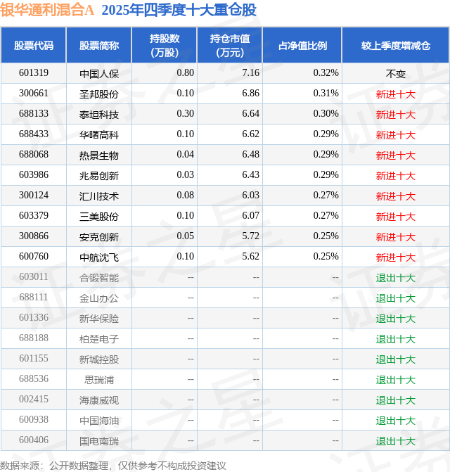 根据2025基金年报公募基金重仓股数据,重仓该股的公募基金共1家,其中持有数量最多的公募基金为银华基金的银华通利混合A。银华通利混合A目前规模为0.13亿元,最新净值1.4124(1月30日),较上一交易日下跌0.1%,近一年上涨4.89%。该公募基金现任基金经理为师华鹏 范博扬。师华鹏在任的基金产品包括:银华美元债精选债券(QDII)A,管理时间为2024年5月17日至今,期间收益率为7.2%。范博扬在任的基金产品包括:银华美元债精选债券(QDII)A,管理时间为2025年12月2日至今,期间收益率为-1.14%。