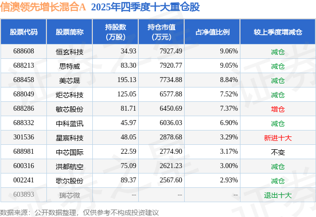 信澳领先增长混合A的前十大重仓股如下: