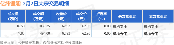 证券之星消息,2月2日亿纬锂能发生大宗交易,交易数据如下: