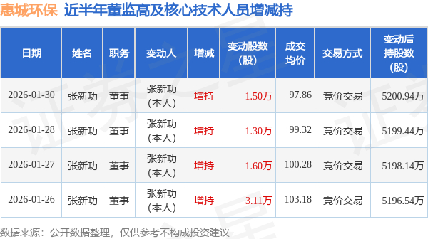 证券之星消息,根据2月2日市场公开信息、上市公司公告及交易所披露数据整理,惠城环保(300779)最新董监高及相关人员股份变动情况:2026年1月30日公司董事张新功共增持公司股份1.5万股,占公司总股本为0.0075%。变动期间公司股价下跌0.35%,1月30日当日收盘报97.71元。