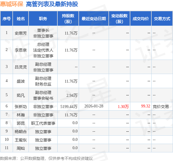 惠城环保的高管列表及最新持股情况如下: