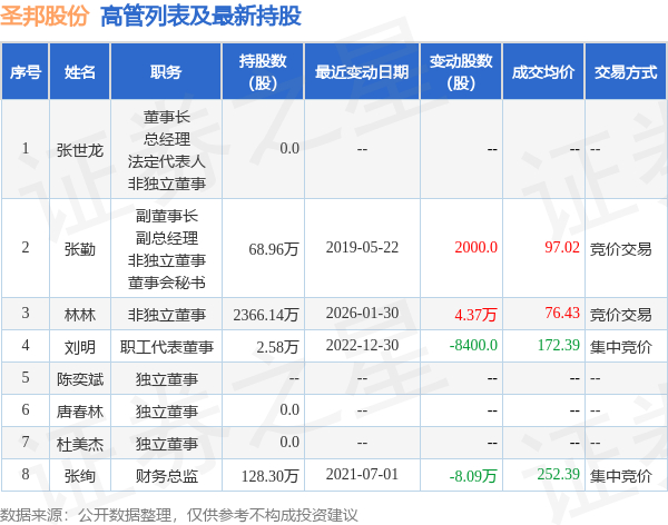 圣邦股份近半年内的董监高及核心技术人员增减持详情如下: