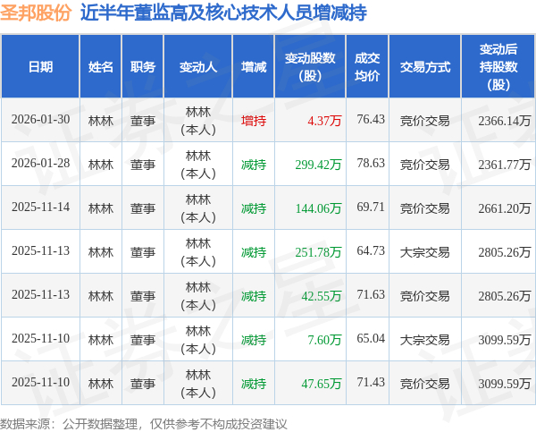 证券之星消息,根据2月2日市场公开信息、上市公司公告及交易所披露数据整理,圣邦股份(300661)最新董监高及相关人员股份变动情况:2026年1月30日公司董事林林共增持公司股份4.37万股,占公司总股本为0.0071%。变动期间公司股价上涨0.91%,1月30日当日收盘报76.14元。