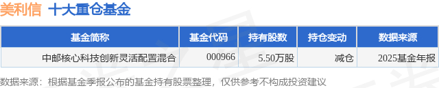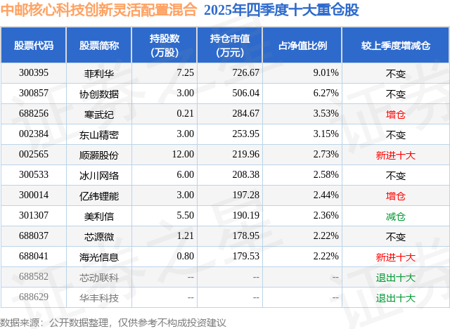 根据2025基金年报公募基金重仓股数据,重仓该股的公募基金共1家,其中持有数量最多的公募基金为中邮基金的中邮核心科技创新灵活配置混合。中邮核心科技创新灵活配置混合目前规模为0.81亿元,最新净值1.713(2月2日),较上一交易日下跌3.55%,近一年上涨34.56%。该公募基金现任基金经理为曹思。曹思在任的基金产品包括:中邮中小盘灵活配置混合A,管理时间为2021年2月18日至今,期间收益率为16.68%;中邮专精特新一年持有混合A,管理时间为2022年9月14日至今,期间收益率为8.84%。