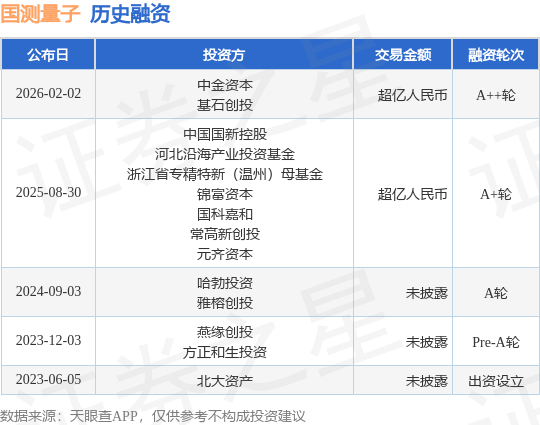 证券之星消息,根据天眼查APP于2月2日公布的信息整理,国测量子科技(浙江)有限公司A++轮融资,融资额超亿人民币,参与投资的机构包括中金资本,基石创投。