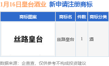 证券之星消息,根据天眼查APP数据显示,近日甘肃皇台酒业股份有限公司新提交“丝路皇台”商标注册申请。商标申请详情如下: