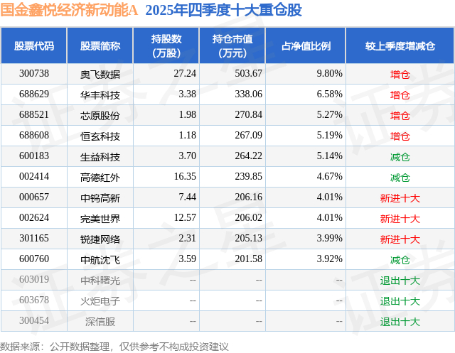 国金鑫悦经济新动能A的前十大重仓股如下: