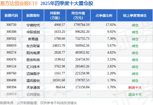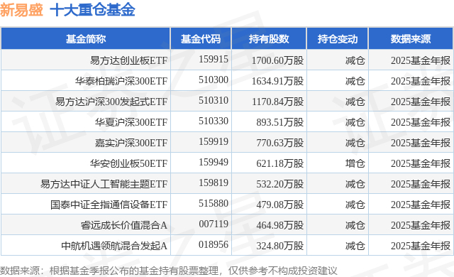 根据2025基金年报公募基金重仓股数据,重仓该股的公募基金共1338家,其中持有数量最多的公募基金为易方达基金的易方达创业板ETF。易方达创业板ETF目前规模为4.46亿元,最新净值3.3123(2月3日),较上一交易日上涨1.86%,近一年上涨63.55%。该公募基金现任基金经理为成曦 刘树荣。成曦在任的基金产品包括:易方达创业板ETF联接A,管理时间为2016年5月7日至今,期间收益率为58.92%;易方达深证100ETF,管理时间为2016年5月7日至今,期间收益率为84.67%;易方达上证科创板50ETF,管理时间为2020年9月28日至今,期间收益率为6.13%。刘树荣在任的基金产品包括:易方达深证100ETF联接A,管理时间为2017年7月18日至今,期间收益率为61.48%;易方达创业板ETF联接A,管理时间为2017年7月18日至今,期间收益率为93.87%;易方达深证100ETF,管理时间为2017年7月18日至今,期间收益率为61.11%;