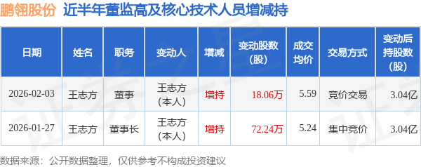 证券之星消息,根据2月4日市场公开信息、上市公司公告及交易所披露数据整理,鹏翎股份(300375)最新董监高及相关人员股份变动情况:2026年2月3日公司董事王志方共增持公司股份18.06万股,占公司总股本为0.0238%。变动期间公司股价上涨1.26%,2月3日当日收盘报5.64元。