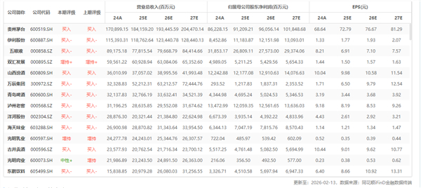 白酒:茅台批价继续上涨,预期及持仓底部下重视春节催化,优选贵州茅台、古井贡酒。伴随春节临近,茅台批价继续上涨,五粮液不少区域反馈动销持平,春节旺季效应在龙头品牌上集中体现。当前白酒处于预期和持仓底部,短期建议持续关注春节旺季催化。26 年全年看,酒企从被动应对进入主动调整,机会在于茅台批价回落并企稳之后,预期筑底企稳,越往年中越明朗。配置视角推荐确定性好且股息率高的茅台,春节大众酒重点推荐古井贡酒,关注五粮液、山西汾酒、泸州老窖的出清节奏,此外模式创新品种珍酒李渡等。