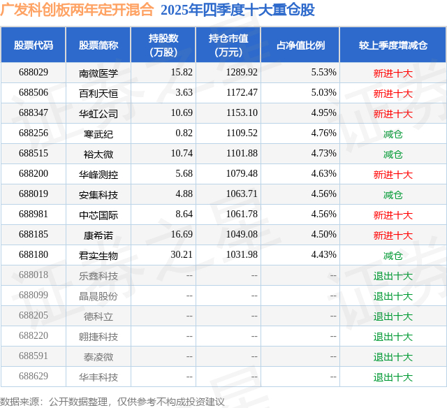 广发科创板两年定开混合的前十大重仓股如下: