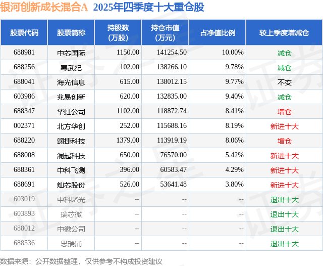 根据2025基金年报公募基金重仓股数据,重仓该股的公募基金共25家,其中持有数量最多的公募基金为银河基金的银河创新成长混合A。银河创新成长混合A目前规模为114.58亿元,最新净值9.7785(2月26日),较上一交易日上涨0.76%,近一年上涨35.56%。该公募基金现任基金经理为郑巍山。郑巍山在任的基金产品包括:银河和美生活混合A,管理时间为2020年2月17日至今,期间收益率为25.23%;银河产业动力混合A,管理时间为2022年3月17日至今,期间收益率为41.44%;银河智联混合A,管理时间为2022年3月17日至今,期间收益率为61.1%。