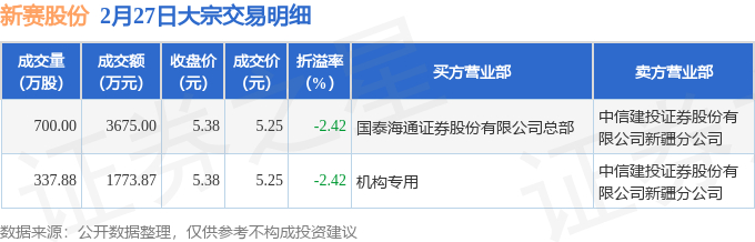 2月27日新赛股份现2笔大宗交易 机构净买入1773.87万元