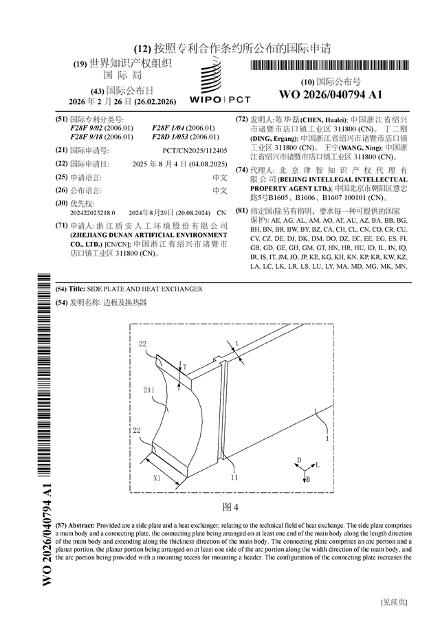 证券之星消息,根据企查查数据显示盾安环境(002011)公布了一项国际专利申请,专利名为“边板及换热器”,专利申请号为PCT/CN2025/112405,国际公布日为2026年2月26日。