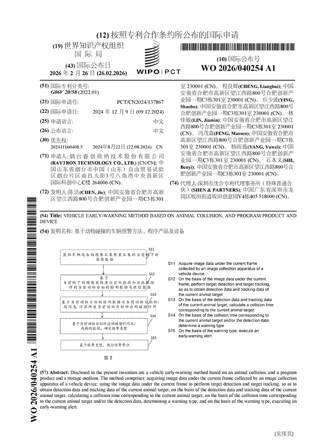 证券之星消息,根据企查查数据显示睿创微纳(688002)公布了一项国际专利申请,专利名为“基于动物碰撞的车辆预警方法、程序产品及设备”,专利申请号为PCT/CN2024/137867,国际公布日为2026年2月26日。