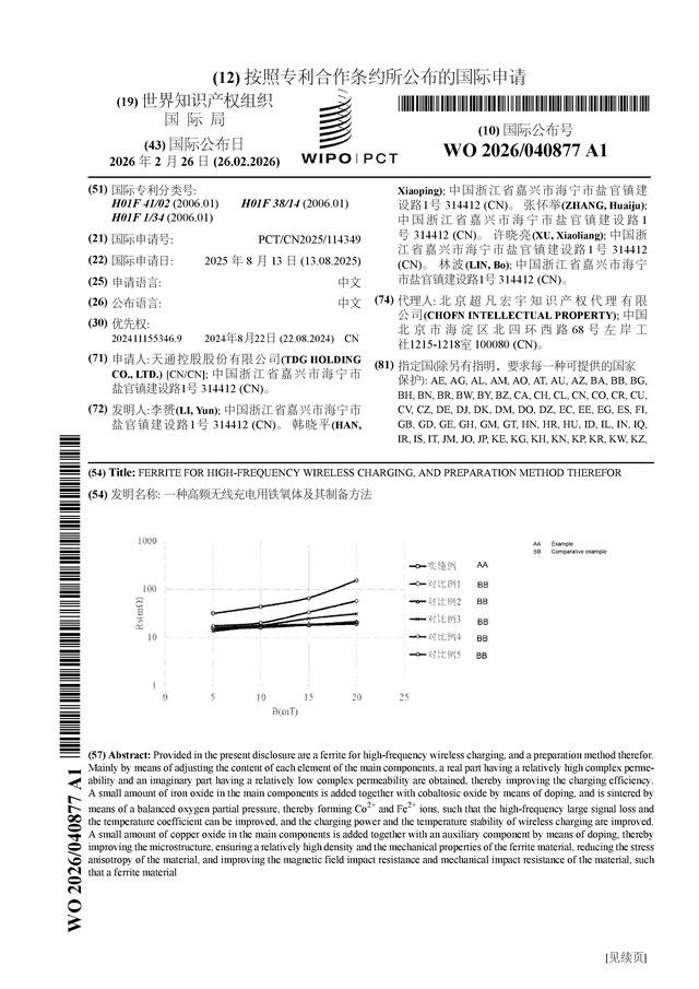 证券之星消息,根据企查查数据显示天通股份(600330)公布了一项国际专利申请,专利名为“一种高频无线充电用铁氧体及其制备方法”,专利申请号为PCT/CN2025/114349,国际公布日为2026年2月26日。