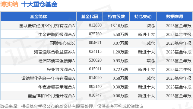 根据2025基金年报公募基金重仓股数据,重仓该股的公募基金共9家,其中持有数量最多的公募基金为国联基金的国联低碳经济3个月持有混合A。国联低碳经济3个月持有混合A目前规模为2.53亿元,最新净值1.2203(2月27日),较上一交易日下跌0.13%,近一年上涨48.49%。该公募基金现任基金经理为吴刚。吴刚在任的基金产品包括:国联核心成长,管理时间为2023年2月28日至今,期间收益率为61.4%。