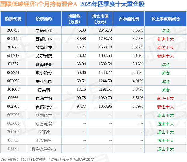 国联低碳经济3个月持有混合A的前十大重仓股如下: