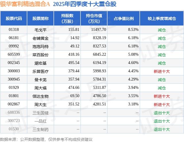 根据2025基金年报公募基金重仓股数据,重仓该股的公募基金共1家,其中持有数量最多的公募基金为银华基金的银华富利精选混合A。银华富利精选混合A目前规模为13.44亿元,最新净值0.6064(2月27日),较上一交易日上涨0.66%,近一年下跌1.41%。该公募基金现任基金经理为焦巍 秦锋。焦巍在任的基金产品包括:银华富裕主题混合A,管理时间为2018年12月27日至今,期间收益率为100.42%;银华富饶精选三年持有期混合,管理时间为2021年5月28日至今,期间收益率为-27.71%;银华富久食品饮料精选混合(LOF)A,管理时间为2021年9月3日至今,期间收益率为-43.43%。秦锋在任的基金产品包括:银华中证全指医药卫生,管理时间为2017年9月28日至今,期间收益率为27.82%;