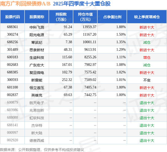 根据2025基金年报公募基金重仓股数据,重仓该股的公募基金共17家,其中持有数量最多的公募基金为南方基金的南方广利回报债券A/B。南方广利回报债券A/B目前规模为62.79亿元,最新净值2.1177(2月27日),较上一交易日下跌0.39%,近一年上涨31.49%。该公募基金现任基金经理为刘文良 王润栋。刘文良在任的基金产品包括:南方希元可转债债券A,管理时间为2018年3月14日至今,期间收益率为100.27%;南方宁利一年定开债发起式,管理时间为2020年2月14日至今,期间收益率为17.47%;南方昌元可转债债券A,管理时间为2020年3月6日至今,期间收益率为121.04%。王润栋在任的基金产品包括:南方乾利定开债,管理时间为2023年2月10日至今,期间收益率为10.59%;南方耀元债券A,管理时间为2023年2月10日至今,期间收益率为7.88%;南方晨利一年定开债券发起,管理时间为2023年3月3日至今,期间收益率为9.65%;南方骏元中短期利率债债券A,管理时间为2023年5月26日至今,期间收益率为7.62%。