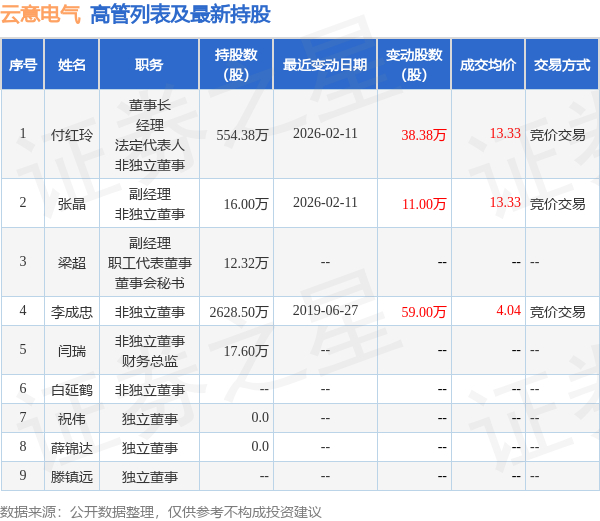 云意电气的高管列表及最新持股情况如下: