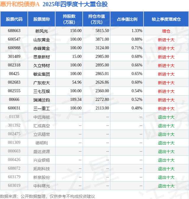 根据2025基金年报公募基金重仓股数据,重仓该股的公募基金共4家,其中持有数量最多的公募基金为惠升基金的惠升和悦债券A。惠升和悦债券A目前规模为43.48亿元,最新净值1.1063(3月2日),较上一交易日上涨0.38%,近一年上涨7.25%。该公募基金现任基金经理为曾华 孙庆。孙庆在任的基金产品包括:惠升和睿兴利债券A,管理时间为2021年3月23日至今,期间收益率为8.67%;惠升惠泽混合A,管理时间为2025年2月6日至今,期间收益率为44.12%;曾华在任的基金产品包括:惠升和赢纯债3个月定开A,管理时间为2022年9月9日至今,期间收益率为10.87%;惠升和裕纯债债券A,管理时间为2022年11月29日至今,期间收益率为11.94%;惠升和怡一年定开债发起式,管理时间为2022年11月29日至今,期间收益率为9.82%。