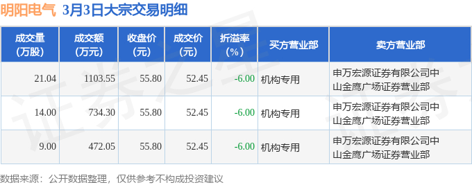 证券之星消息,3月3日明阳电气发生大宗交易,交易数据如下: