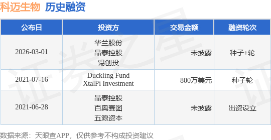 证券之星消息,根据天眼查APP于3月1日公布的信息整理,科迈生物科技(苏州)有限公司种子+轮融资,融资额未披露,参与投资的机构包括华兰股份,晶泰控股,锡创投。