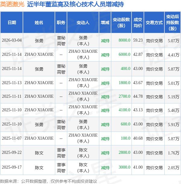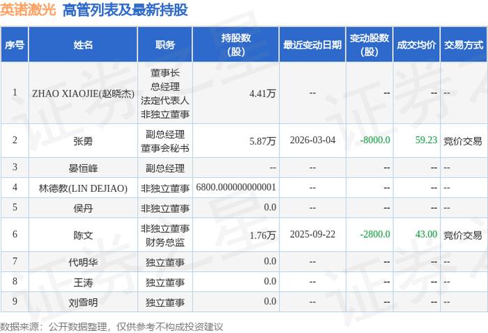 证券之星消息,根据3月5日市场公开信息、上市公司公告及交易所披露数据整理,英诺激光(301021)最新董监高及相关人员股份变动情况:2026年3月4日公司董秘,高管张勇共减持公司股份8000.0股,占公司总股本为0.0052%。变动期间公司股价上涨2.52%,3月4日当日收盘报59.49元。