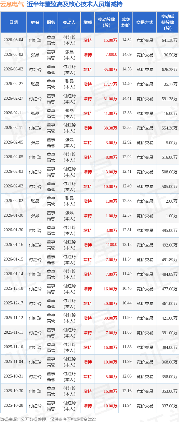 证券之星消息,根据3月5日市场公开信息、上市公司公告及交易所披露数据整理,云意电气(300304)最新董监高及相关人员股份变动情况:2026年3月4日公司董事,高管付红玲共增持公司股份15.0万股,占公司总股本为0.0171%。变动期间公司股价下跌0.76%,3月4日当日收盘报14.29元。