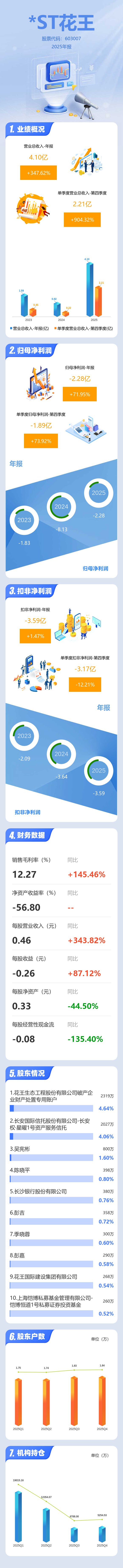 证券之星消息,*ST花王2025年年报显示,当年度公司主营收入4.1亿元,同比上升347.62%;归母净利润-2.28亿元,同比上升71.96%;扣非净利润-3.59亿元,同比上升1.47%;其中2025年第四季度,公司单季度主营收入2.21亿元,同比上升904.33%;单季度归母净利润-1.89亿元,同比上升73.93%;单季度扣非净利润-3.17亿元,同比下降12.21%;负债率76.18%,投资收益21.26万元,财务费用1596.56万元,毛利率12.27%。