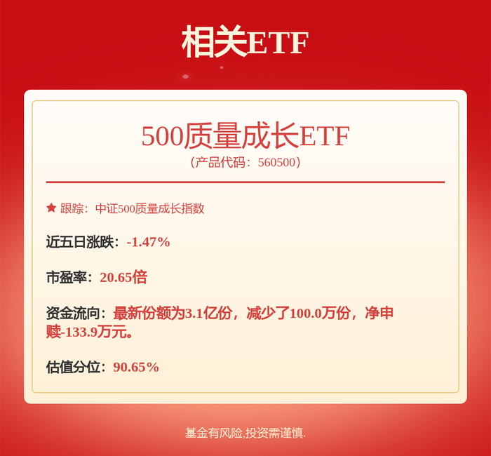 中证500质量成长指数(930939)由中证指数有限公司(“中证”)编制和计算,其所有权归属中证及/或其指定的第三方。中证对于标的指数的实时性、准确性、完整性和特殊目的的适用性不作任何明示或暗示的担保,不因标的指数的任何延迟、缺失或错误对任何人承担责任(无论是否存在过失)。中证对于跟踪标的指数的产品不作任何担保、背书、销售或推广,中证不承担与此相关的任何责任。本基金为被动投资的交易型开放式指数基金,主要采用完全复制策略,跟踪标的指数市场表现,具有与标的指数所表征的市场相似的风险收益特征。投资者投资于本基金面临标的指数回报与相应市场平均回报偏离、标的指数波动、跟踪误差控制未达约定目标、标的指数变更、指数编制机构停止服务、成份股停牌或退市等潜在风险。
