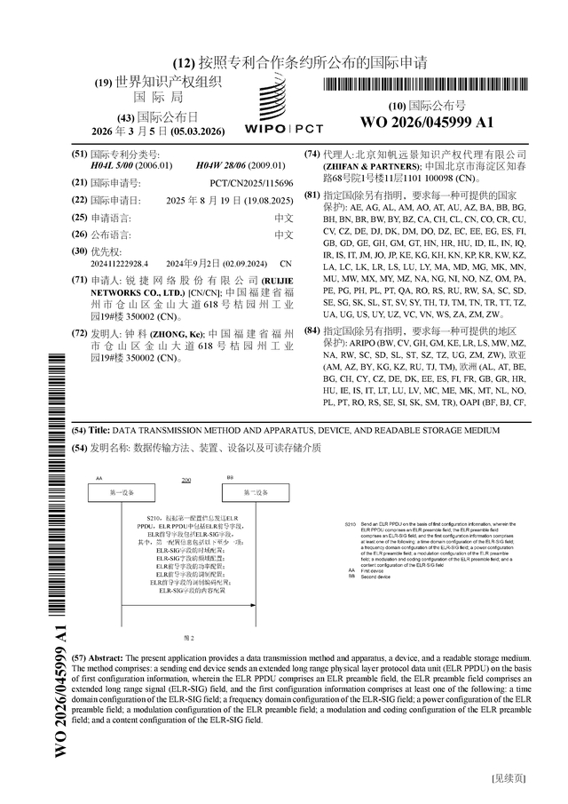 证券之星消息,根据企查查数据显示锐捷网络(301165)公布了一项国际专利申请,专利名为“数据传输方法、装置、设备以及可读存储介质”,专利申请号为PCT/CN2025/115696,国际公布日为2026年3月5日。