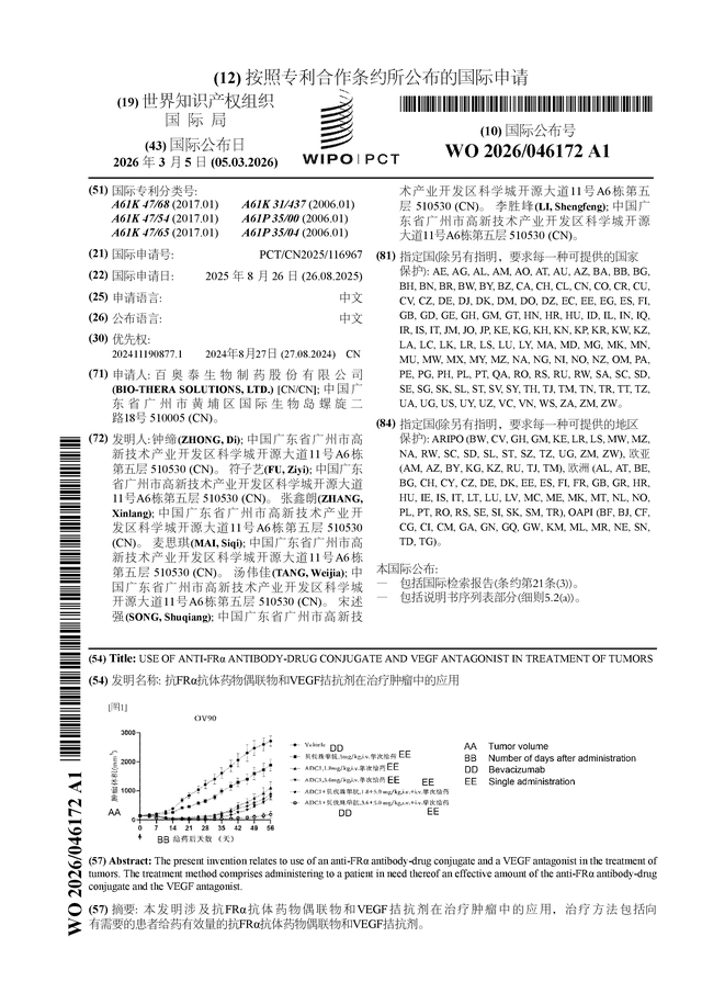 证券之星消息,根据企查查数据显示百奥泰(688177)公布了一项国际专利申请,专利名为“抗FRα抗体药物偶联物和VEGF拮抗剂在治疗肿瘤中的应用”,专利申请号为PCT/CN2025/116967,国际公布日为2026年3月5日。