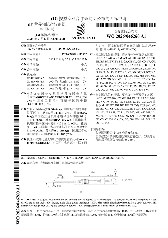 证券之星消息,根据企查查数据显示安杰思(688581)公布了一项国际专利申请,专利名为“手术器具及应用于内窥镜的辅助装置”,专利申请号为PCT/CN2025/117377,国际公布日为2026年3月5日。