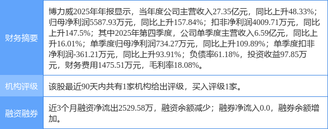 2026年2月27日,华鑫证券研究员黎江涛发布了对博力威的研报《公司动态研究报告:大圆柱电芯放量,业绩进入上行期》,该研报对博力威给出“买入”评级。研报中预测公司2025-2027年收入分别为26.8、32.5、38.7亿元,EPS分别为0.58、1.04、1.34元,当前股价对应PE分别为66、37、29倍,考虑到公司大圆柱电芯产能释放,业绩进入上行通道,给予“买入”投资评级。证券之星数据中心根据近三年发布的研报数据计算,该研报作者对此股的盈利预测准确度为15.78%。