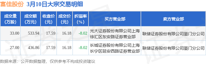 3月10日富佳股份现970.8万元大宗交易