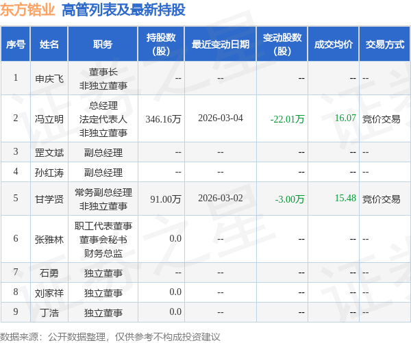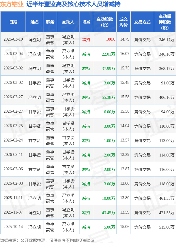 证券之星消息,根据3月11日市场公开信息、上市公司公告及交易所披露数据整理,东方锆业(002167)最新董监高及相关人员股份变动情况:2026年3月10日公司董事,高管冯立明共增持公司股份100.0股,占公司总股本为0.0001%。变动期间公司股价下跌2.37%,3月10日当日收盘报14.8元。