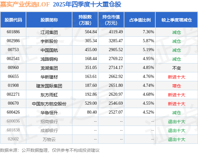 嘉实产业优选LOF的前十大重仓股如下: