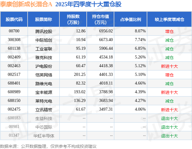 泰康创新成长混合A的前十大重仓股如下: