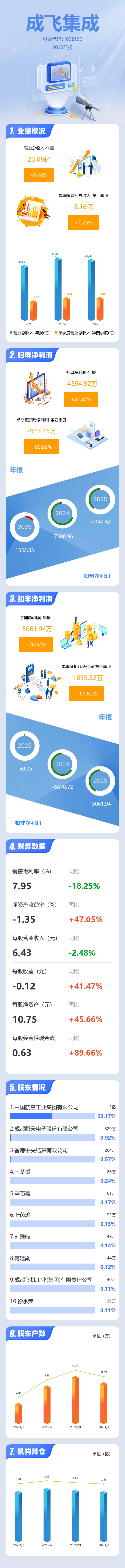 证券之星消息,成飞集成2025年年报显示,当年度公司主营收入23.08亿元,同比下降2.49%;归母净利润-4394.92万元,同比上升41.47%;扣非净利润-5061.94万元,同比上升26.33%;其中2025年第四季度,公司单季度主营收入8.16亿元,同比上升1.77%;单季度归母净利润-943.45万元,同比上升80.89%;单季度扣非净利润-1639.32万元,同比上升61.5%;负债率35.13%,投资收益-1511.41万元,财务费用890.49万元,毛利率7.95%。