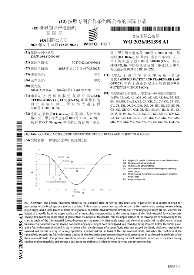 证券之星消息,根据企查查数据显示杰克科技(603337)公布了一项国际专利申请,专利名为“一种缝纫机防断针的控制方法”,专利申请号为PCT/CN2025/093051,国际公布日为2026年3月12日。