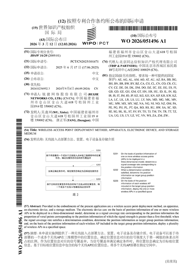 证券之星消息,根据企查查数据显示锐捷网络(301165)公布了一项国际专利申请,专利名为“无线接入点部署方法、装置、电子设备及存储介质”,专利申请号为PCT/CN2025/101471,国际公布日为2026年3月12日。