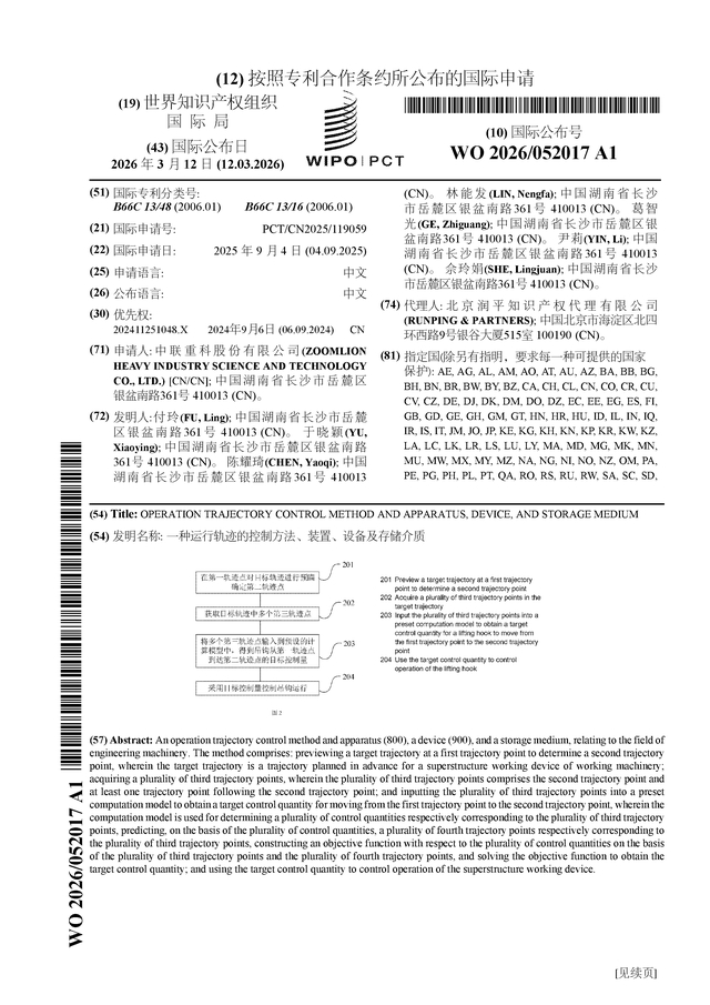 证券之星消息,根据企查查数据显示中联重科(000157)公布了一项国际专利申请,专利名为“一种运行轨迹的控制方法、装置、设备及存储介质”,专利申请号为PCT/CN2025/119059,国际公布日为2026年3月12日。
