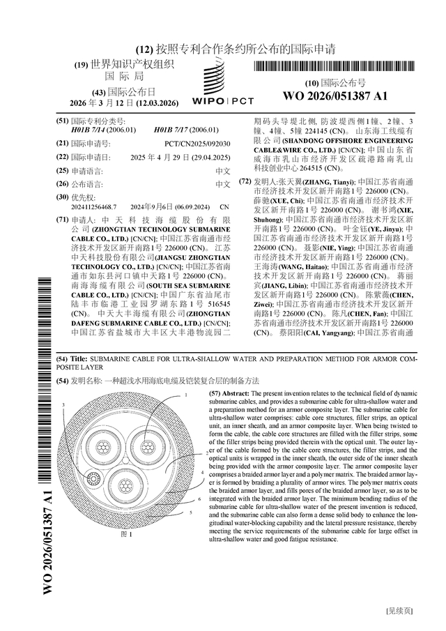 证券之星消息,根据企查查数据显示中天科技(600522)公布了一项国际专利申请,专利名为“一种超浅水用海底电缆及铠装复合层的制备方法”,专利申请号为PCT/CN2025/092030,国际公布日为2026年3月12日。