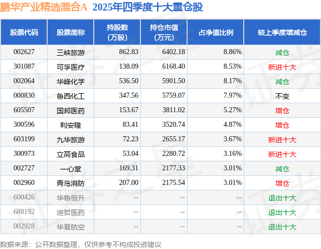 鹏华产业精选混合A的前十大重仓股如下: