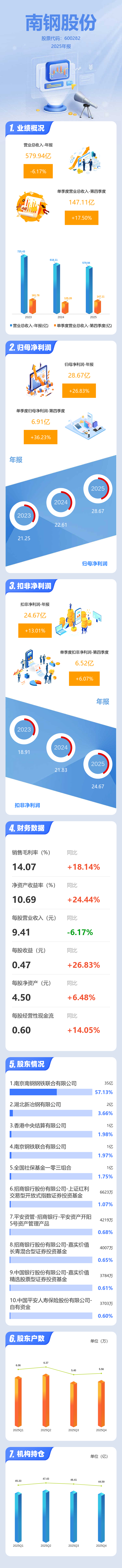 证券之星消息,南钢股份2025年年报显示,当年度公司主营收入579.94亿元,同比下降6.17%;归母净利润28.67亿元,同比上升26.83%;扣非净利润24.67亿元,同比上升13.02%;其中2025年第四季度,公司单季度主营收入147.11亿元,同比上升17.5%;单季度归母净利润6.91亿元,同比上升36.23%;单季度扣非净利润6.52亿元,同比上升6.08%;负债率58.07%,投资收益8183.4万元,财务费用4.94亿元,毛利率14.07%。