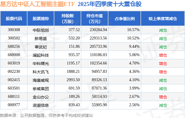 易方达中证人工智能主题ETF的前十大重仓股如下: