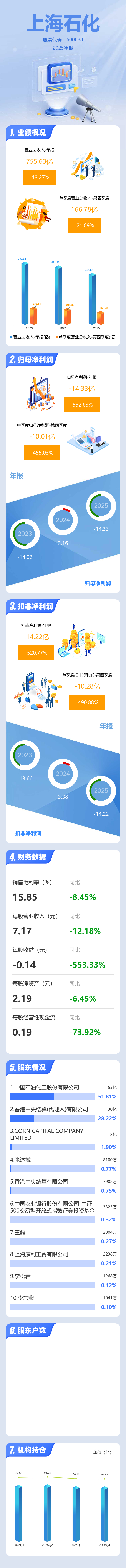 证券之星消息,上海石化2025年年报显示,当年度公司主营收入755.63亿元,同比下降13.28%;归母净利润-14.33亿元,同比下降552.64%;扣非净利润-14.22亿元,同比下降520.78%;其中2025年第四季度,公司单季度主营收入166.78亿元,同比下降21.1%;单季度归母净利润-10.01亿元,同比下降455.04%;单季度扣非净利润-10.28亿元,同比下降490.89%;负债率41.74%,投资收益1.78亿元,财务费用-1.65亿元,毛利率15.85%。