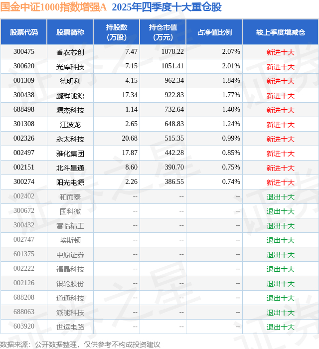 根据2025基金年报公募基金重仓股数据,重仓该股的公募基金共1家,其中持有数量最多的公募基金为国金基金的国金中证1000指数增强A。国金中证1000指数增强A目前规模为1.81亿元,最新净值1.4463(3月18日),较上一交易日上涨1.08%,近一年上涨83.51%。该公募基金现任基金经理为李洪超。李洪超在任的基金产品包括:国金300指数增强A,管理时间为2025年7月24日至今,期间收益率为16.91%。